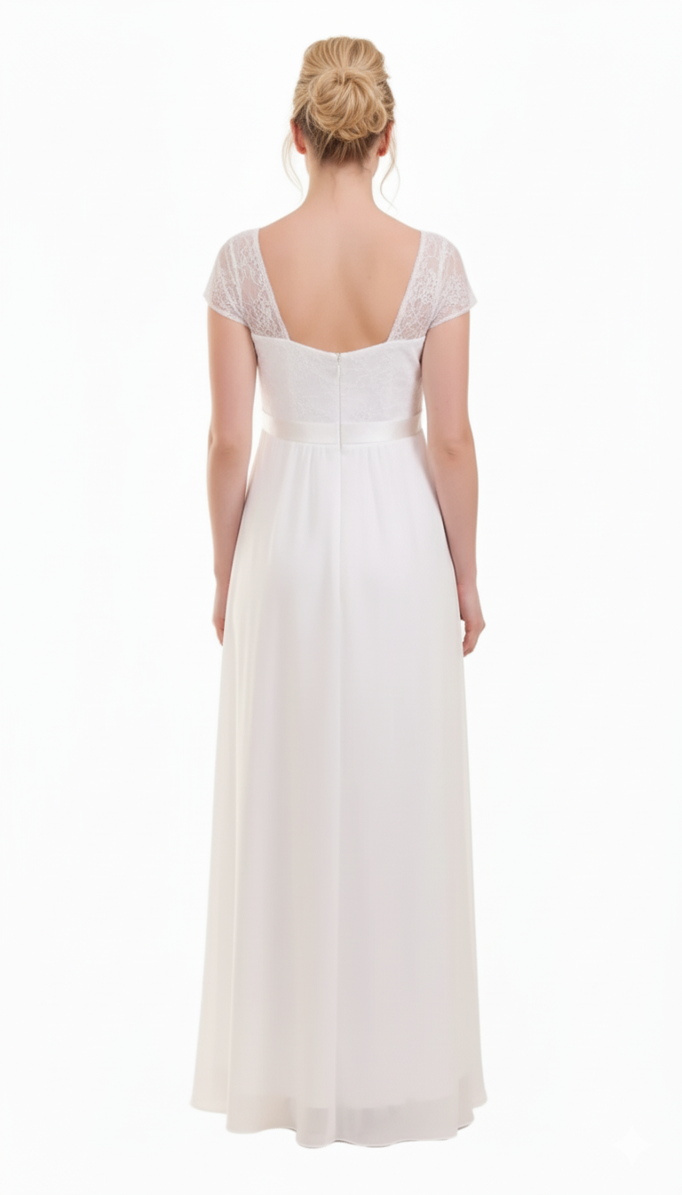 Cette robe de marié pour femme enceinte , une coupe empire intemporelle, conçue pour un confort maximal et une silhouette sublimée. Des détails romantique, buste élégant avec un décolleté en cœur et de fines manches / bretelles en dentelle florale. Jupe longue en mousseline légère qui tombe gracieusement, assurant aisance de mouvent. Finitions délicates, un nœud en satin marque la taille haute, mettant en valeur le ventre de façon chic et subtile.  Parfait pour la mariée enceinte qui rêve d'une tenue chic, confortable et pleine de douceur pour son grand jour.